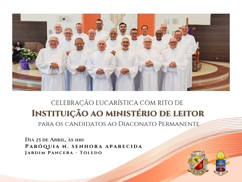 A família diocesana se alegra neste dia (25/04) com a Solene Celebração Eucarística que inclui o Rito de Instituição do Ministério de Leitor para os candidatos ao Diaconato Permanente, nas dependências da Igreja Matriz da Paróquia Nossa Senhora Aparecida, em Toledo, às 10h de hoje.